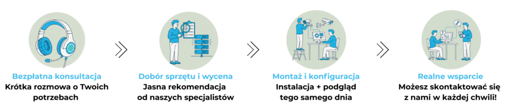 Oferujemy kompleksowy dobór kamer, montaż, okablowanie, konfigurację aplikacji, uruchomienie nagrywania, szkolenia z obsługi oraz wsparcie serwisowe (dodatkowo płatne albo w abonamencie albo płatne za wizytę).